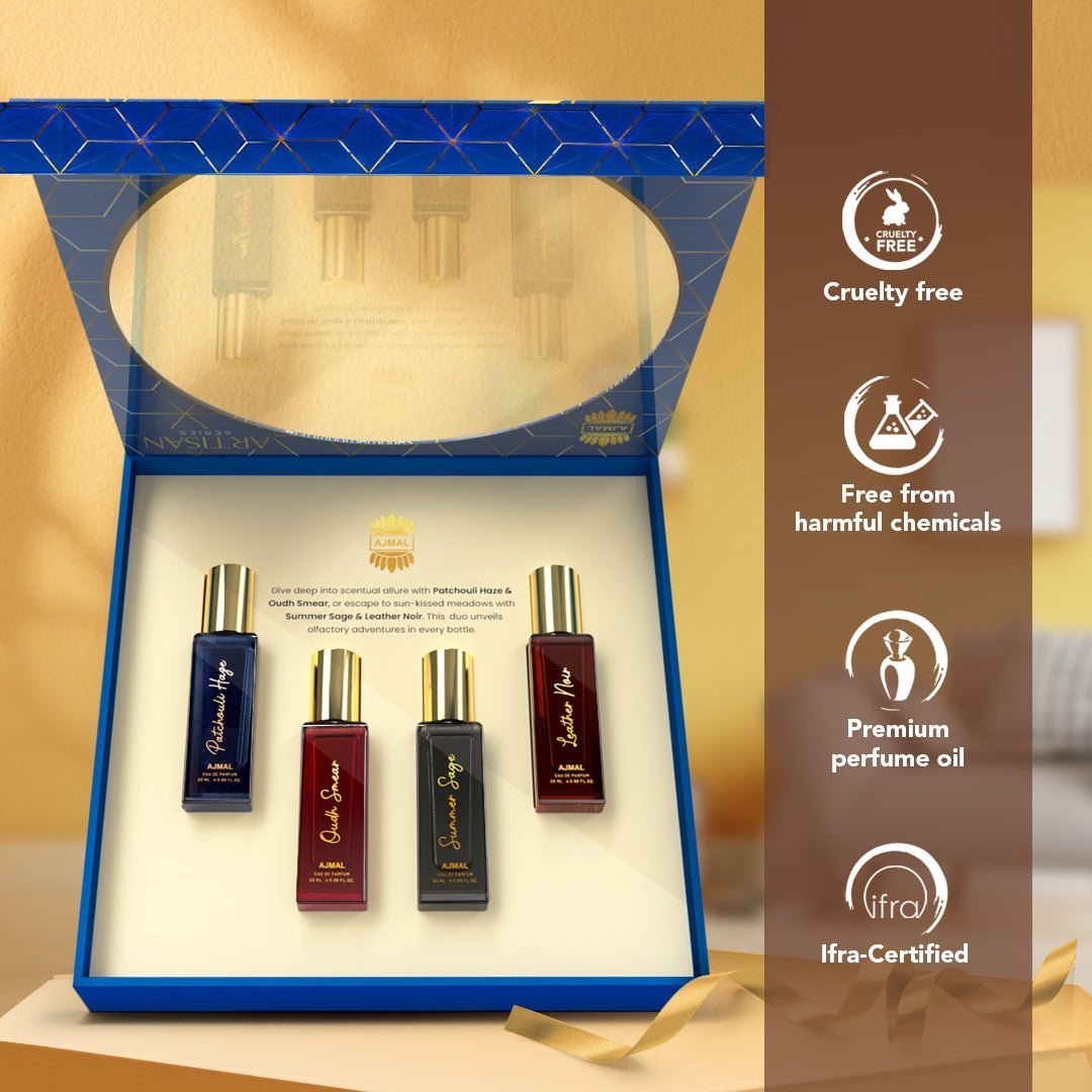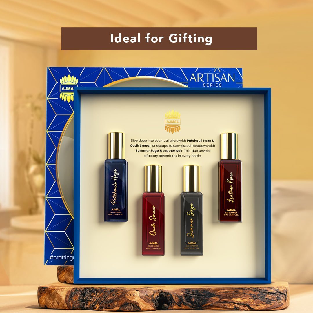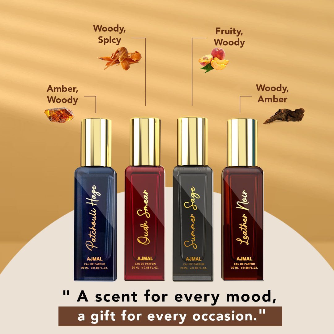 Top Note : LEATHER-NOIR_EDP_20ML : BERGAMOT, MANDARIN. OUDH-SMEAR_EDP_20Ml : Bergamot, Black Pepper. PATCHOULI-HAZE_EDP_20ML : Apple, Lemon, Bergamot, RosemarySUMMER-SAGE_EDP_20ML : Heart Note : LEATHER-NOIR_EDP_20ML : CARDAMOM, ELEMI. OUDH-SMEAR_EDP_20Ml : Rose, Jasmine, Saffron. PATCHOULI-HAZE_EDP_20ML : Rose, Patchouli, Labdanum. SUMMER-SAGE_EDP_20ML : Jasmine , Violet Base Note : LEATHER-NOIR_EDP_20ML : Leather, Raspberry, Vanilla, Amber, Cedarwood. OUDH-SMEAR_EDP_20Ml : Tobacco, Agarwood, Leather. PATCHOULI-HAZE_EDP_20ML : Musk, Tobacco, Vanilla. SUMMER-SAGE_EDP_20ML : Patchouli, Vetiver, Guaic Wood